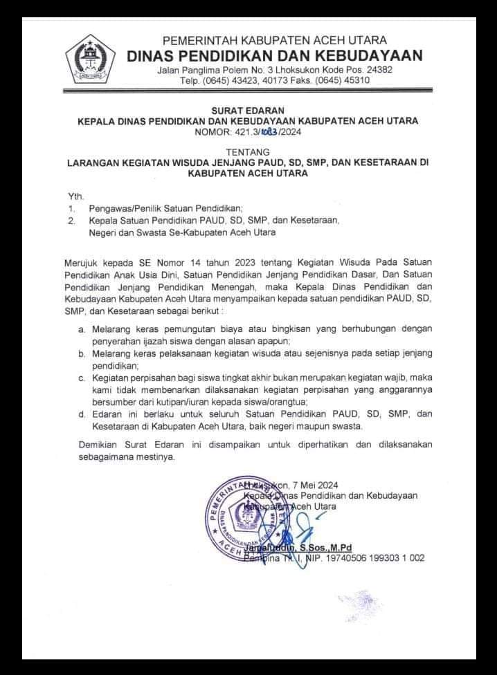 ACEH UTARA – Dinas Pendidikan dan Kebudayaan Kabupaten Aceh Utara mengeluarkan surat edaran dengan Nomor : 421.3/1083/2024 Tentang Larangan Kegiatan Wisuda Jenjang PAUD, SD, SMP dan Kesetaraan di Kabupaten Aceh Utara, Selasa, (7 Mei 2024).