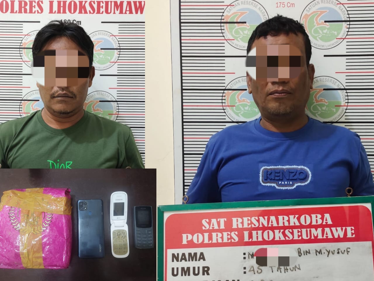 Kepada awak media, kamis (9/1/2025) pagi, Kapolres Lhokseumawe AKBP Henki Ismanto, S.I.K melalui Kasat Narkoba AKP Wijaya Yudi Stira Putra mengatakan, Dua pria yang diamankan adalah MY (45), seorang sopir warga Blang Mangat, serta KA (46), seorang PNS yang tinggal di lokasi penangkapan di Desa Meunasah Mee.