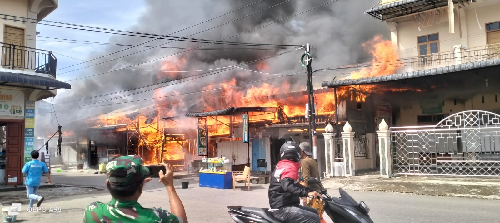 Kebakaran yang terjadi sekitar pukul 11.10 WIB ini menghanguskan beberapa unit ruko, yang sebagian besar terbuat dari bahan kayu, serta sejumlah bangunan lainnya di sekitarnya. Selain itu, deretan menasah (tempat ibadah) yang berada di dekat lokasi kejadian juga ikut terbakar.