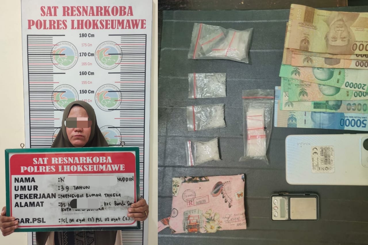 Lhokseumawe – Satuan Reserse Narkoba Polres Lhokseumawe berhasil mengamankan seorang perempuan yang diduga terlibat dalam tindak pidana penyalahgunaan narkotika jenis sabu pada Selasa (21/1/2025) sekitar pukul 17.30 WIB. Pelaku berinisial Nurlatifah (39), seorang ibu rumah tangga, ditangkap di rumahnya di Desa Hagu Teungoh, Kecamatan Banda Sakti, Kota Lhokseumawe.