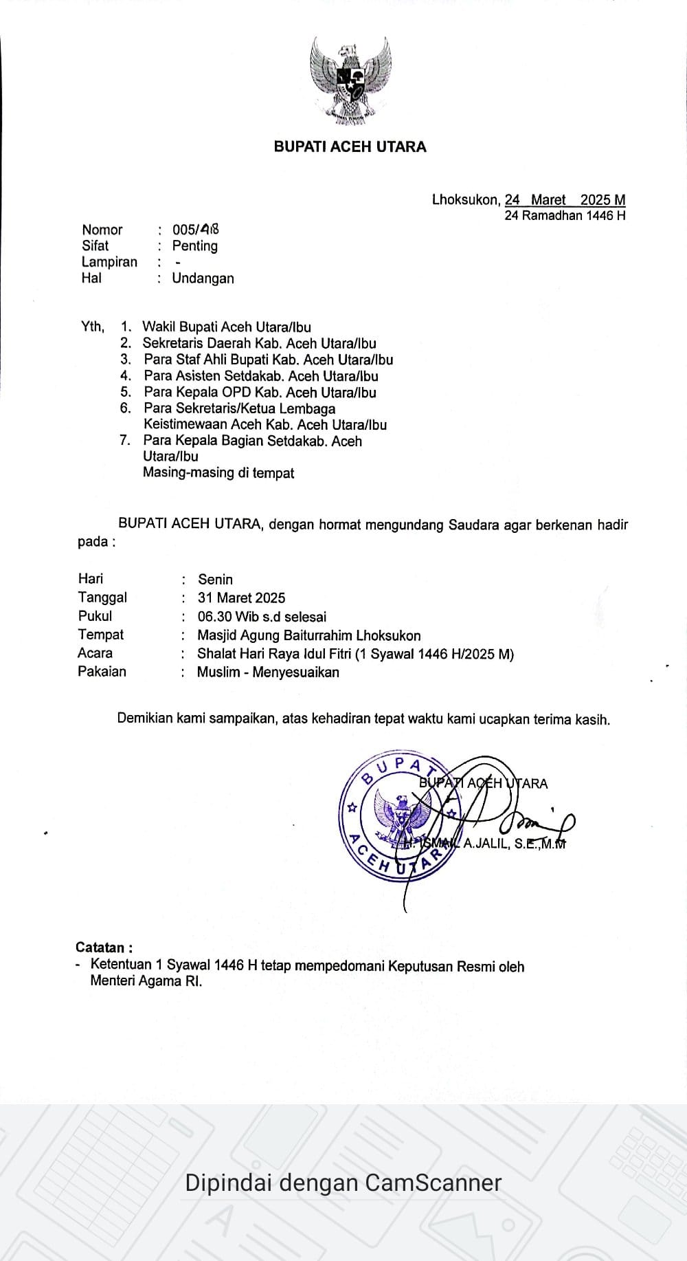 Bupati Aceh Utara, H. Ismail A. Jalil, S.E., M.M juga menegaskan bahwa pelaksanaan 1 Syawal 1446 H akan tetap mengikuti keputusan resmi yang telah dikeluarkan oleh Menteri Agama RI, memastikan keseragaman dan kesakralan perayaan Idul Fitri di Aceh Utara.