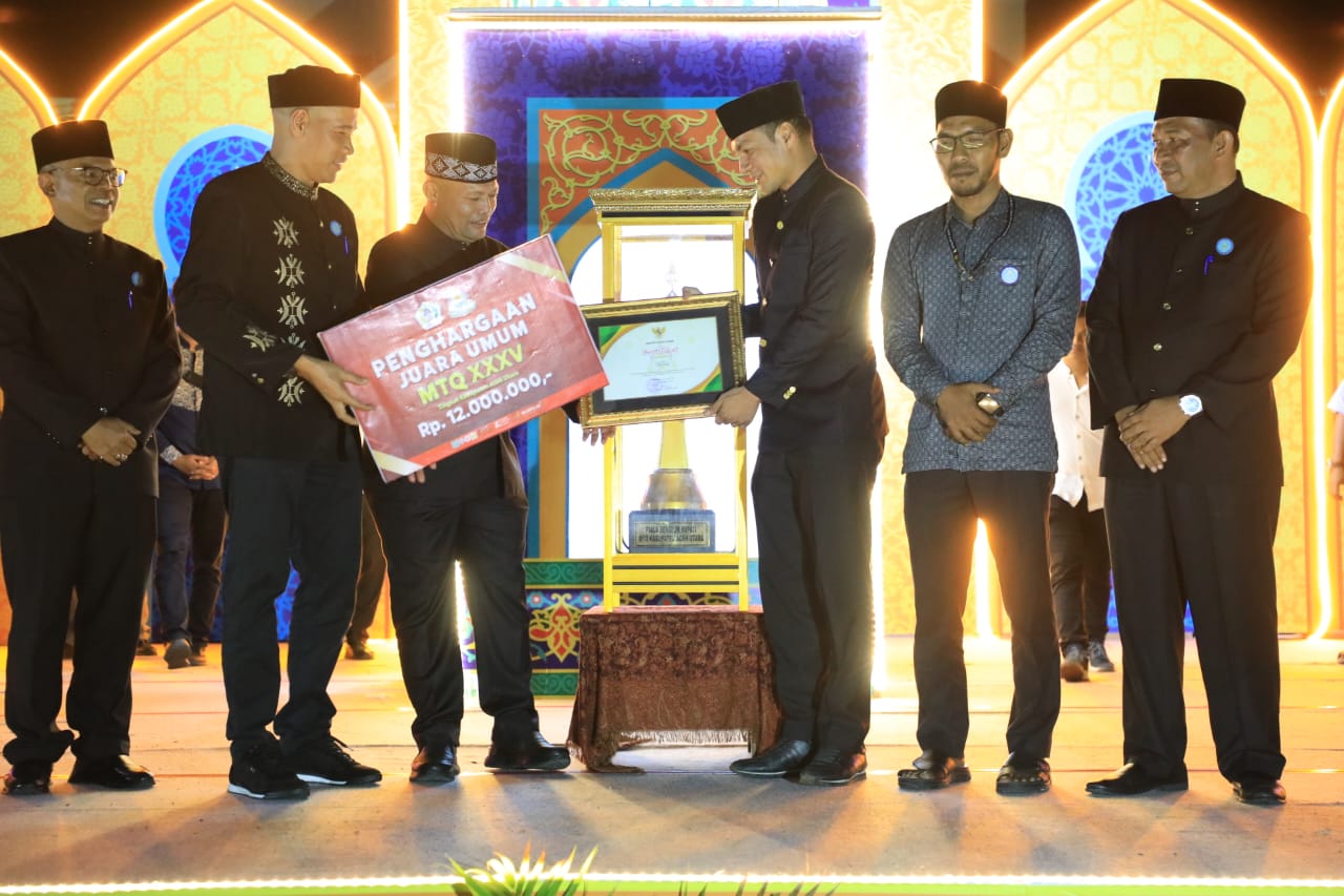 Wakil Bupati Tarmizi Panyang menyerahkan langsung piala bergilir kepada kafilah Tanah Jambo Aye yang diterima oleh Camat Fauzi Saputra, SIP, turut disaksikan Bupati H Ismail A Jalil, SE, MM, Sekda Dr A Murtala, MSi, dan Kepala Dinas Syariat Islam Hadaini, SSos.
