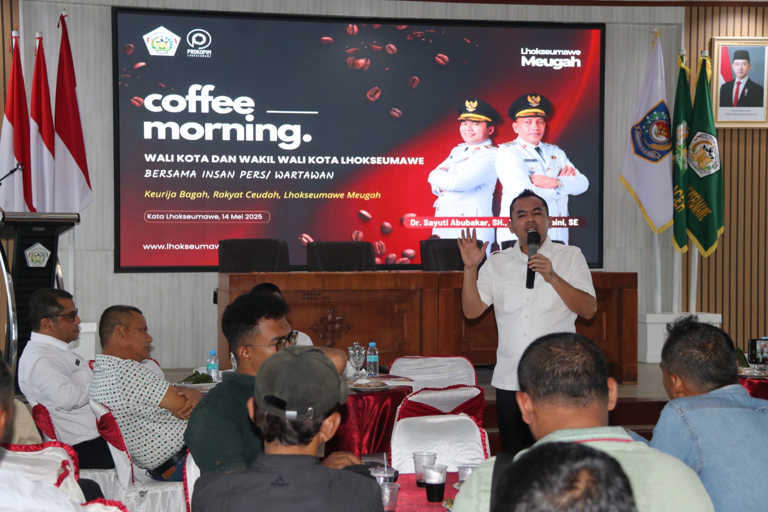 Lhokseumawe – Pemerintah Kota Lhokseumawe menggelar kegiatan Coffee Morning bersama para wartawan yang bertugas di wilayah Kota Lhokseumawe di Aula Kantor Wali Kota Lhokseumawe, Rabu (14/5). Kegiatan yang berlangsung dalam suasana akrab dan dialogis ini dihadiri oleh ratusan jurnalis dari berbagai media cetak, daring, hingga penyiaran termasuk perwakilan dari organisasi profesi seperti PWI, PWA, IJTI, AJI, dan PFI sebagai bentuk sinergi dan keterbukaan antara pemerintah dengan insan pers.