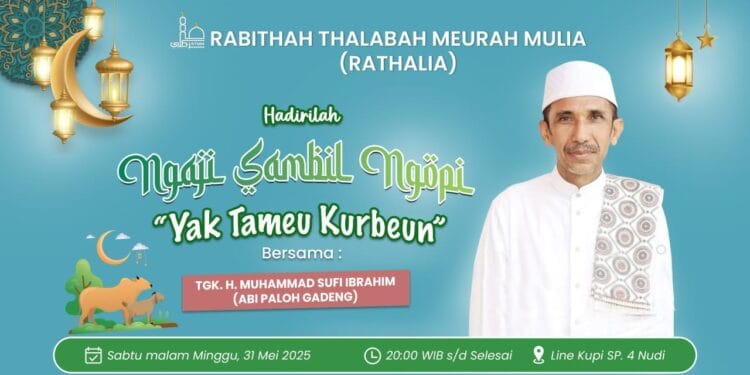 Aceh Utara – Menyambut datangnya bulan Zulhijjah, Rabithah Thalabah Meurah Mulia (RATHALIA) akan menggelar pengajian akbar bertajuk “Yak Tameu Kurbeun”. Acara ini akan dilaksanakan pada Sabtu malam (31/5/2025), mulai pukul 20.00 WIB hingga selesai, bertempat di Line Kupi, Simpang 4 Nudi, Kecamatan Meurah Mulia, Kabupaten Aceh Utara.