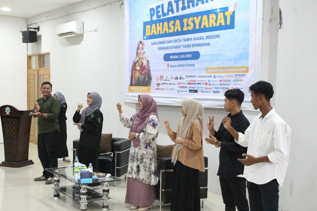 Lhokseumawe – Himpunan Mahasiswa Jurusan (HMJ) Komunikasi dan Penyiaran Islam (KPI), Fakultas Ushuluddin, Adab dan Dakwah (FUAD), UIN Sultanah Nahrasiyah Lhokseumawe menggelar Pelatihan Bahasa Isyarat bertajuk “Menjembatani Cinta Tanpa Suara: Berseni Dengan Isyarat Yang Bermakna” pada Selasa, 1 Juli 2025, bertempat di lantai 3 Gedung FUAD.
