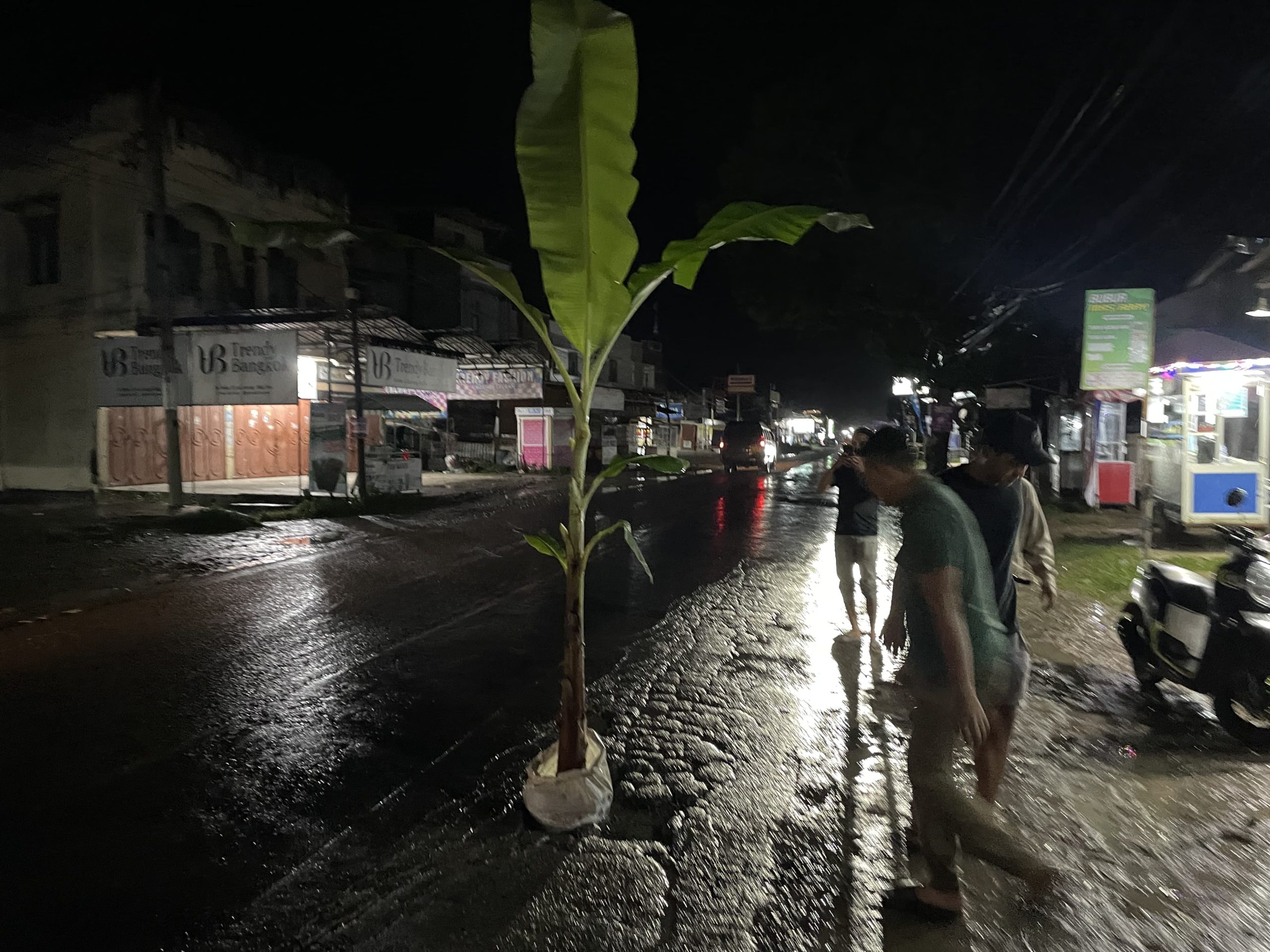 Aceh Utara — Aksi warga menanam pohon pisang di jalan rusak depan Bank Aceh KCP Geudong, Gampong Blang Peuria, Kecamatan Samudera, Minggu malam (19/10/2025), viral di media sosial. Aksi itu sebagai bentuk protes atas kerusakan jalan nasional Medan–Banda Aceh yang telah lama dikeluhkan pengguna jalan.